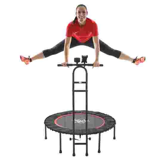 The Joka Fit “Cacau 2.0” fitness trampoline is a particularly resilient and robust trampoline made of powder-coated steel. The large jumping zone provides plenty of space for jumping exercises or fitness training using resistance tubes. The trampoline bed is made of UV-resistant polypropylene and is permeable to water and air. The trampoline bed is connected to the frame by rubber cord suspension. Rubber cords make trampoline training more effective and gentler on the joints. The fitness trampoline is equipped with 32 bungees. One bungee consists of over 100 individual rubber bands, which are covered with a particularly stretchy nylon fabric. The detachable handlebars included are attached to the trampoline using 2 plug-in holders. The bar extends down to the ground and has 2 additional feet, which perfectly absorb vibrations and shocks. These feet are equipped with rubber caps to prevent the trainer from slipping and to protect the flooring. The jump counter allows the sensitivity to be adjusted according to weight and intensity. Furthermore, the training time and the average number of calories burnt are reliably recorded.
