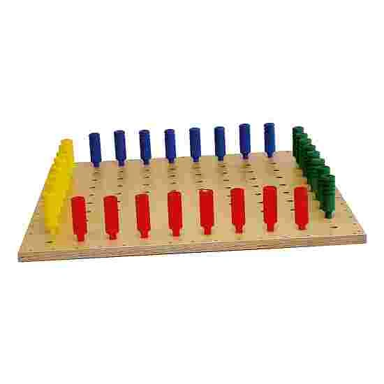 The 10-cm-tall pins can easily be identified by blind and visually impaired people thanks to their milled grooves. The board measuring 75×75 cm trains the motor system of the upper body, shoulders and arms. On the back there is a 10×10 grid of holes which you can even uses for mathematical exercises.