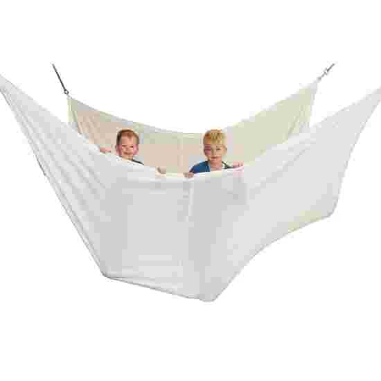 Children in particular love swinging, swaying and floating in this hammock whilst experiencing a feeling of weightlessness. You can also step around in it, giving you the feeling you are walking on a cloud. The large cloth can hold several children at once. It can be shaped differently by hanging it with one, two or four points. The very tear-proof, hard-wearing cloth is 100% polyethylene. It has a rope sewn all the way around it and loops on the corners to hang it up. It is strong enough to hold several children at once.