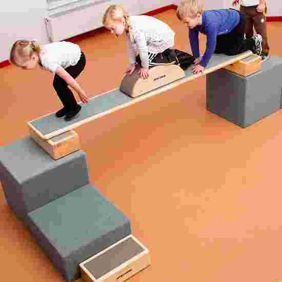 Cube for use in modular exercise areas. The sturdy and light wooden construction is covered in pleasant needle felt and motivates children to build, climb and do gymnastics.