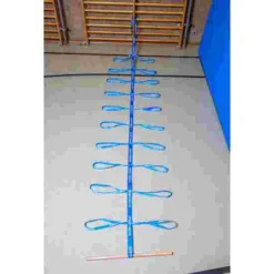 The Sport-Thieme team slackline is a balancing line and is attached to the middle vertical bar of wall bars at one end. One child stretches the line with the wooden rod whilst the children holding the loops ensure the necessary tensioning and stability for a child to balance on the line. The line is also suitable for tug of war and chain tag.
